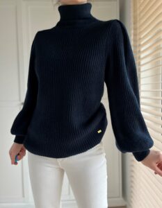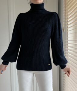 Granatowy golf w prążki Jean Paul , bufiaste rękawy 50% wełna 50% akryl