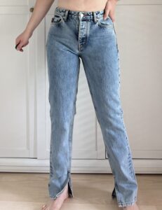 spodnie ze średnim stanem i rozcięciem na końcu nogawek