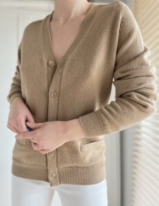 Kardigan Uniqlo w kolorze kawy z mlekiem 100% wełna, certyfikat Woolmark