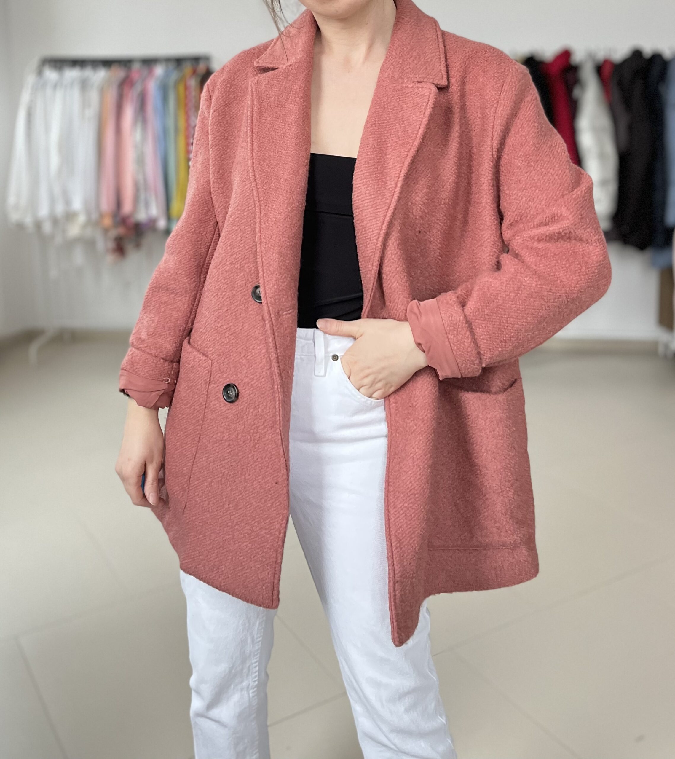 Plaszcz 45% welna, 55% poliester, podszewka poliester.