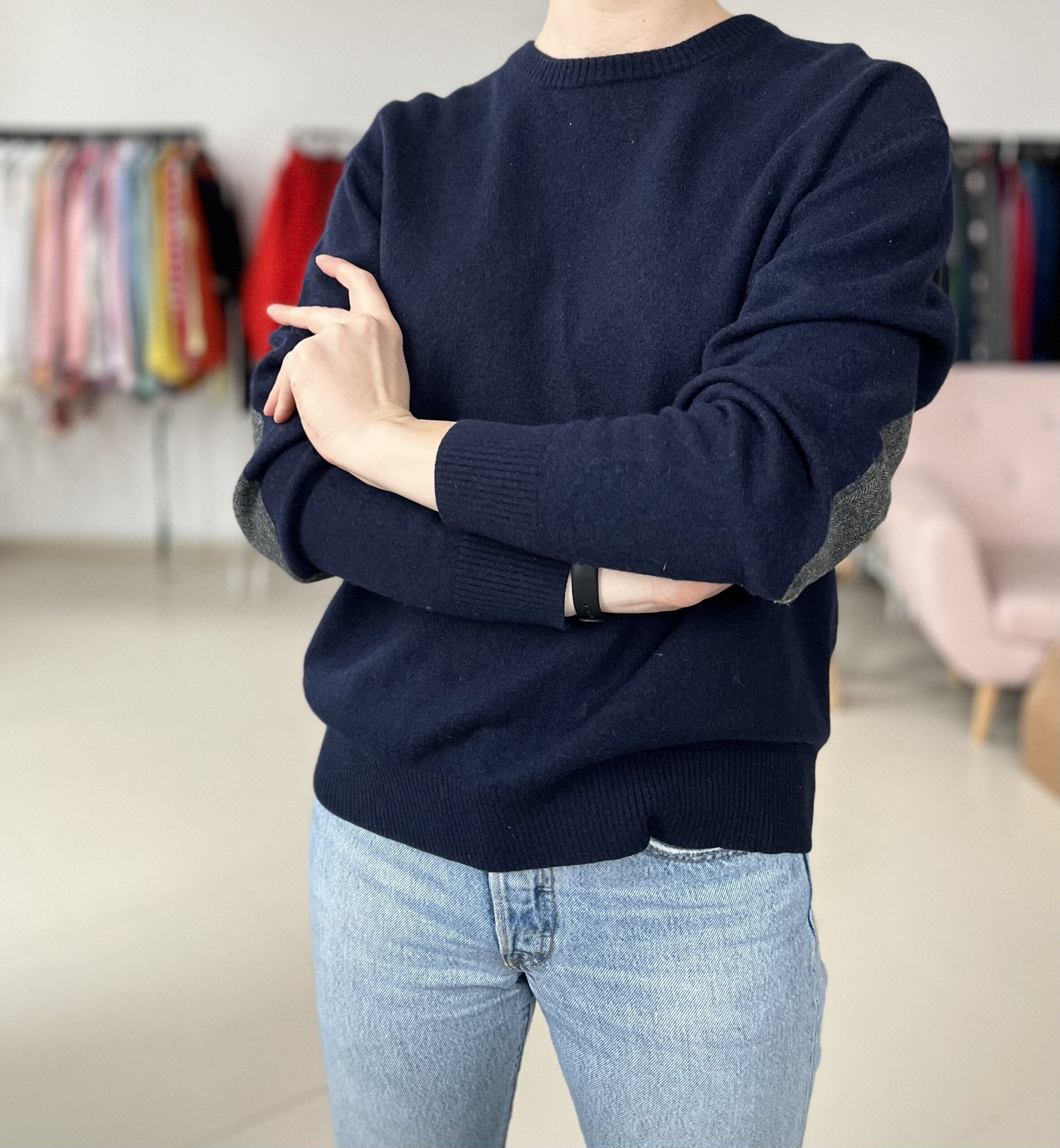 Granatowy sweter 100% lambswool z łatami na rekawach.