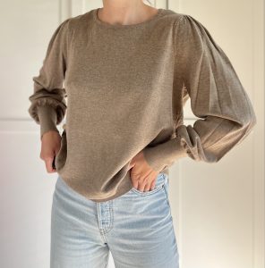 Beżowy sweterek z bufiastymi rękawami 55% merino 45% bawełna