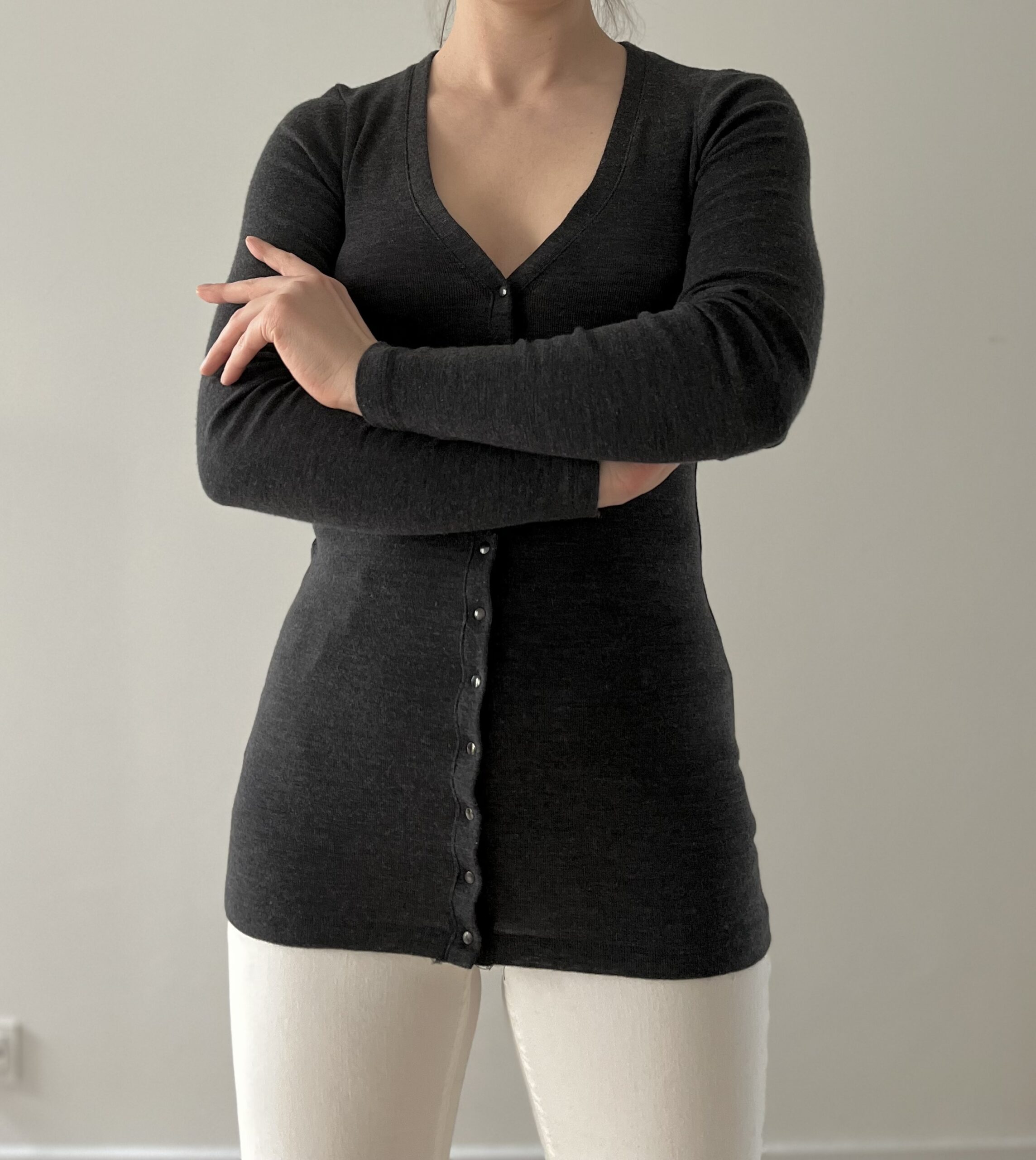 Sweterek na zatrzaski grafitowy Woolmark 100% merino.