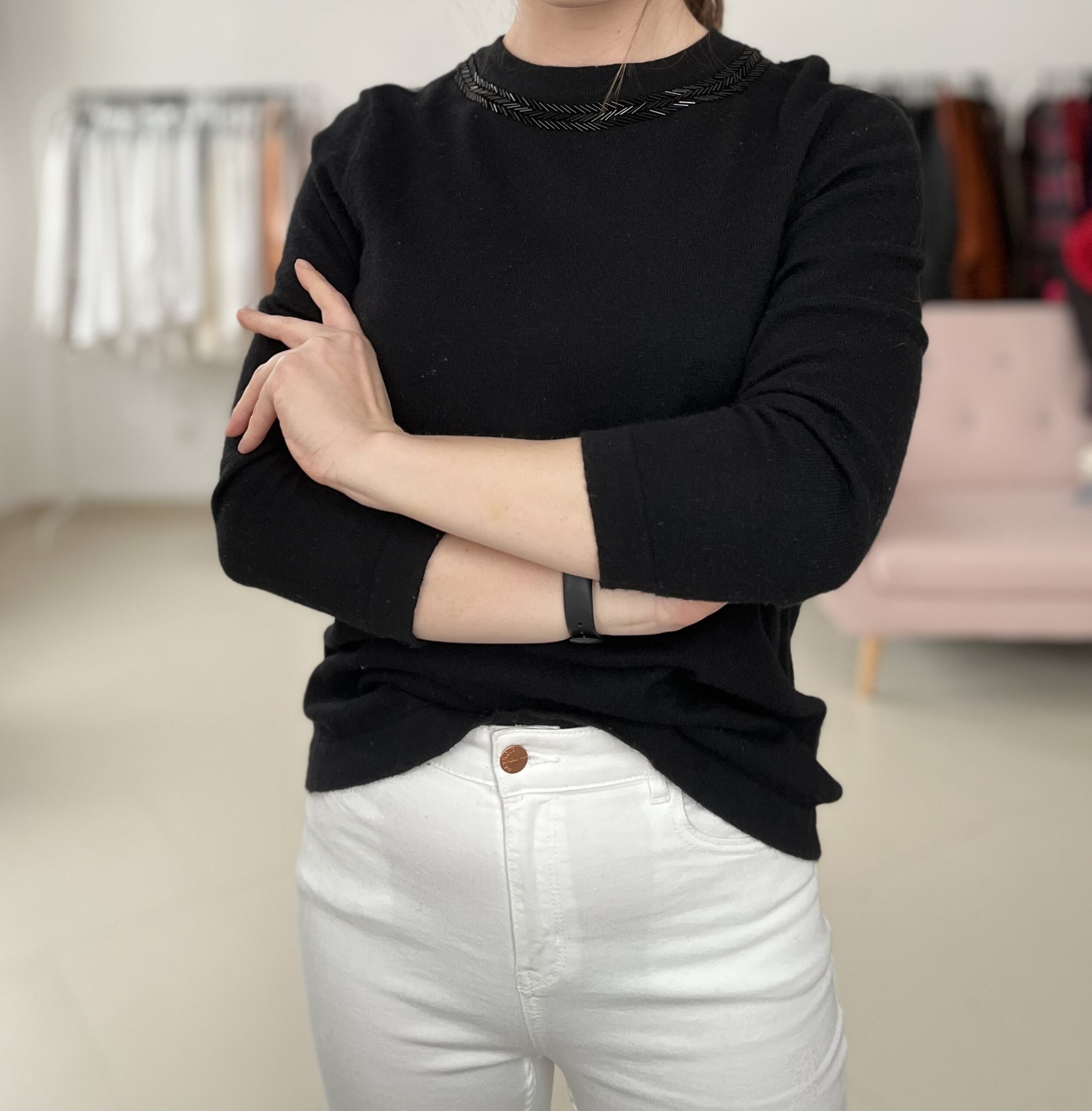 Czarny sweterek z aplikacja przy szyi, bardzo miękki
