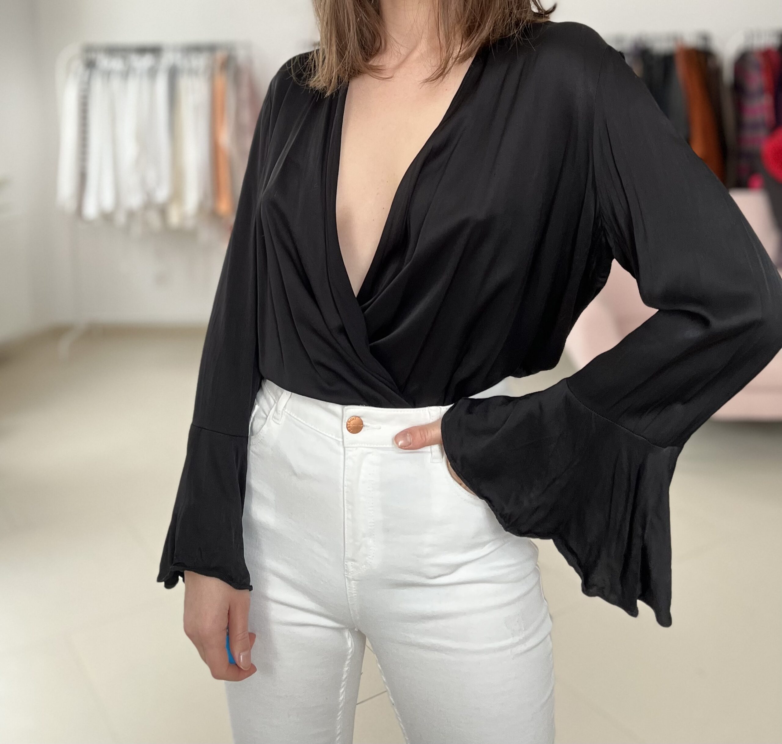 Bluzka nie ma zapiecia, mozna zawiazac, lub wlozyc w spodnie jak na zdjeciu.